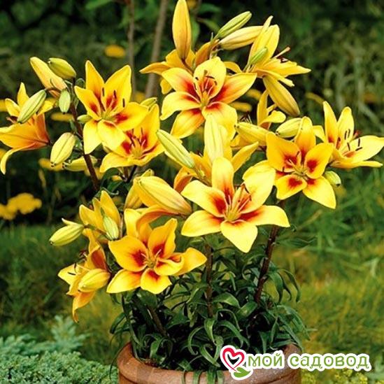 Оригинальная лилия с ее необычной окраской станет предметом восхищения гостей и соседей. Цветет этот сорт в середине июля. На стебле образуется до 7 цветков направленных вверх. Лепестки среднего размера, желтые, с красно-коричневым основанием и пыльниками, не отгибаются. Очаровательная лилия необычайно хороша в срезке. Высаживать Grand Cru (Гранд Крю) на клумбе лучше среди многолетников с желтыми или синими цветками. Посадка лилии: Глубина посадки лилии зависит от почвы. Если почва легкая – можно углубить на 12-13 см, что составляет 3-4 диаметра луковицы. Если же почва глинистая или тяжелая, достаточно двух диаметров, глубина лунки не более 5 см. В выкопанную ямку насыпьте слой песка, установите луковицу донышком на песок, присыпьте сверху остатками грунта, сверху замульчируйте. Уход за лилией: Пышных бутонов у лилий можно добиться, соблюдая обычные правила ухода: в первый год лилиям не нужна весенняя подкормка, удобрения вносятся разово за сезон, после цветения. Но это лишь в том случае, если перед посадкой вносилось удобрение. Перед началом цветения высокорослые сорта рекомендуется подвязать. После цветения засохшие бутоны удаляют. Полив умеренный: лучше не долить, чем перелить. Если цветок начал чахнуть и имеются подозрения на перелив – смешайте по столовой ложке речного песка и древесной золы, высыпьте под цветок и не поливайте ближайшую неделю. Полив лилии важно проводить под корень, старайтесь исключить попадание воды на листья, это провоцирует ожоги на солнце и распространение грибковых заболеваний.